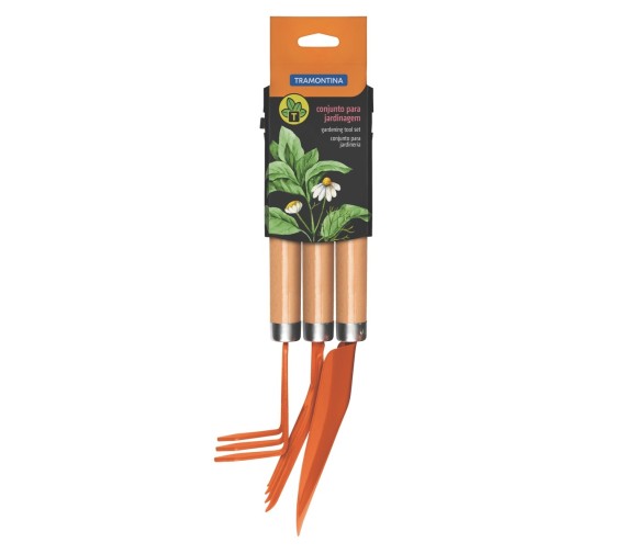 CONJUNTO PARA JARDINAGEM TRAMONTINA PEÇAS METÁLICAS COM CABO DE MADEIRA 3 PEÇAS
