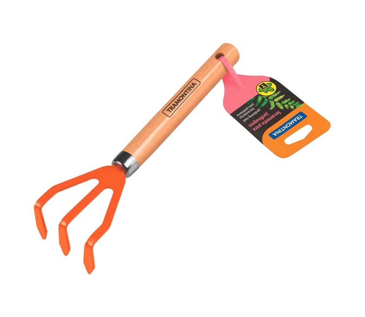 ANCINHO METÁLICO COM 3 DENTES PARA JARDINAGEM TRAMONTINA COM CABO DE MADEIRA