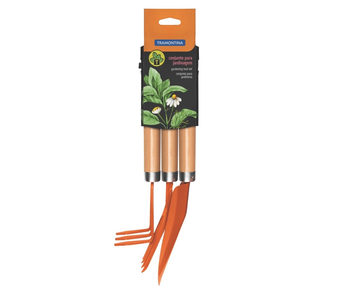 CONJUNTO PARA JARDINAGEM TRAMONTINA PEÇAS METÁLICAS COM CABO DE MADEIRA 3 PEÇAS